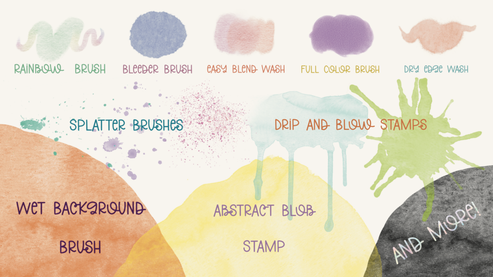 Background brushes, a variety of wet and dry wash brushes, detail brush, and splash, blow, splatter, and drip effect stamp brushes